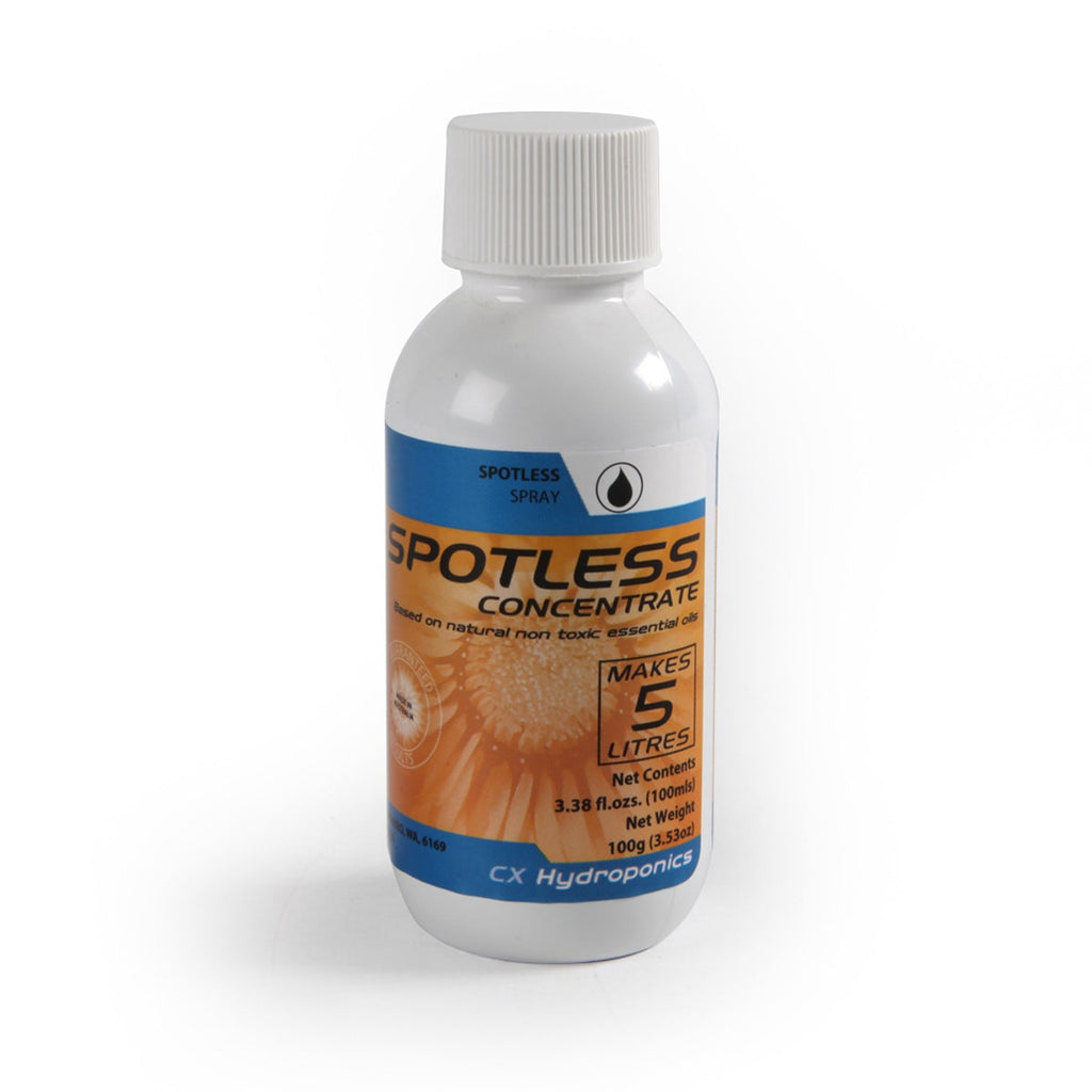 CX Horticulture Spotless is an organic, non-toxic foliar spray concentrate that kills spider mites, whitefly larvae, and aphids on contact by dissolving their outer coating — no chemicals, no poisons, no withholding period. It's fast, it's clean, and it works as part of integrated pest management or as an emergency response when infestation hits. One 20ml bottle makes 5 litres of ready-to-use spray, so it goes a long way.
